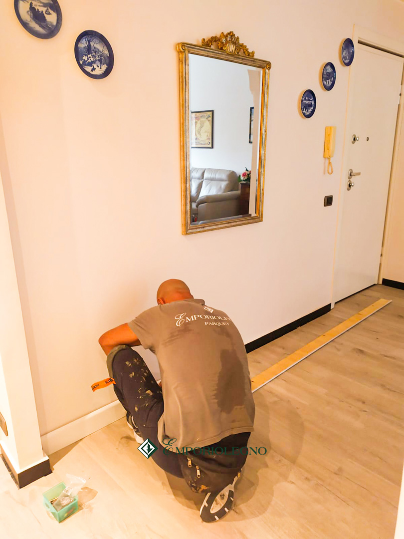 Il battiscopa esistente, in ardesia, è stato ricoperto con un copriardesia laccato bianco (vedi foto) per evitarne la rimozione e semplificare al massimo la posa in opera.
