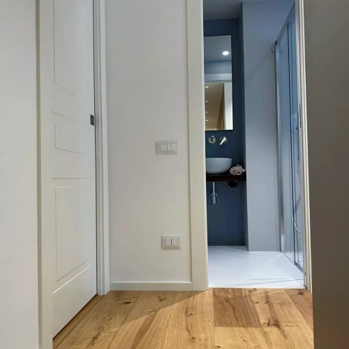 L’aspetto è morbido e luminoso, lo spazio risulta dilatato dalle grandi plance e dal battiscopa moderno laccato bianco e squadrato.